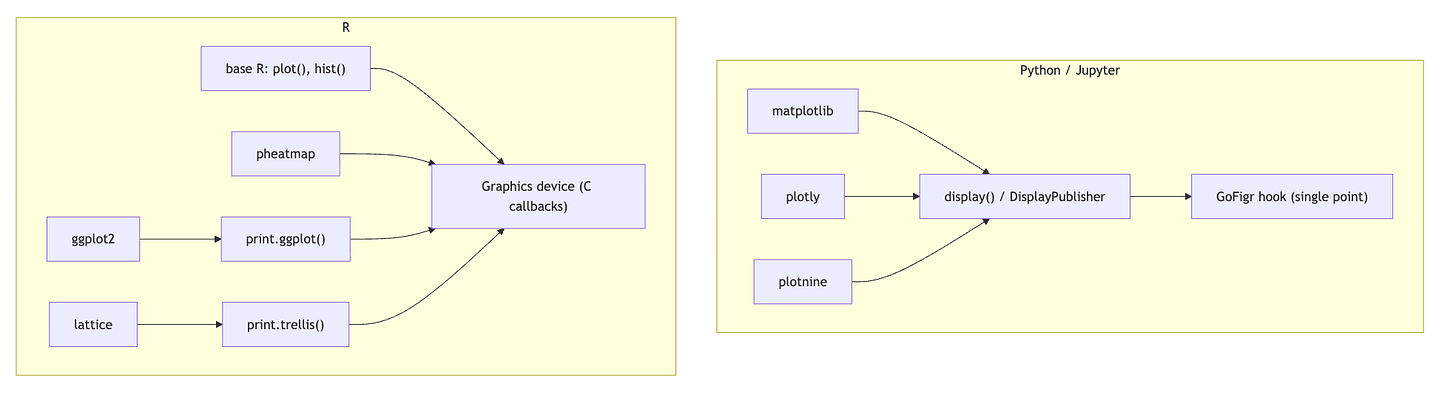 In an ideal world, all plot output would flow through a single chokepoint we can instrument. Python’s Jupyter ecosystem gives us exactly that. R does not.