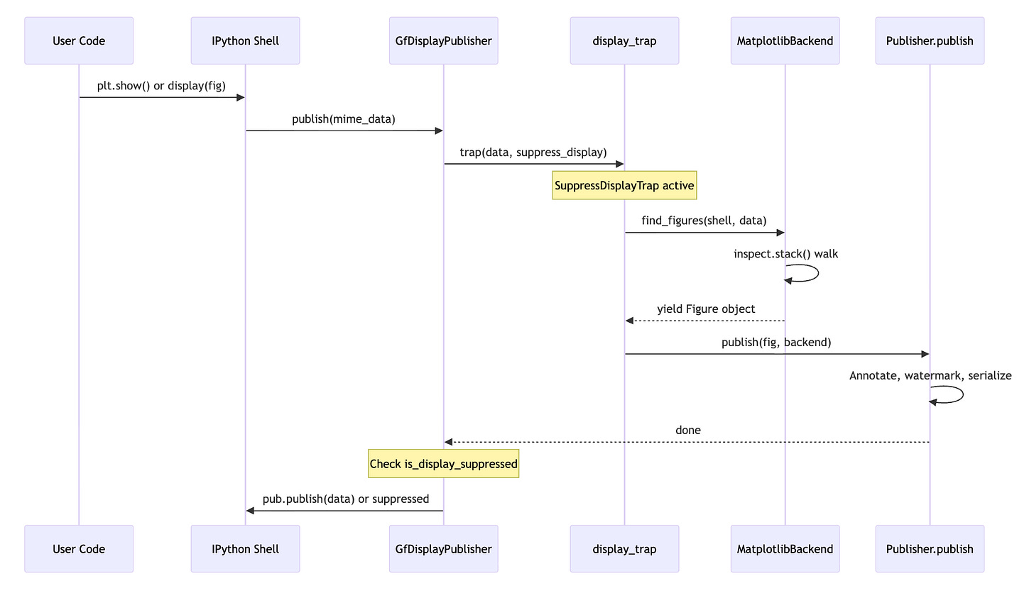 yield arg_valueThis is admittedly a hack -- we’re relying on the internal call structure of matplotlib and plotly. But it’s a stable hack: these libraries’ display paths haven’t changed in years, and if they do, the failure mode is graceful (we just don’t find the figure and skip auto-publish).