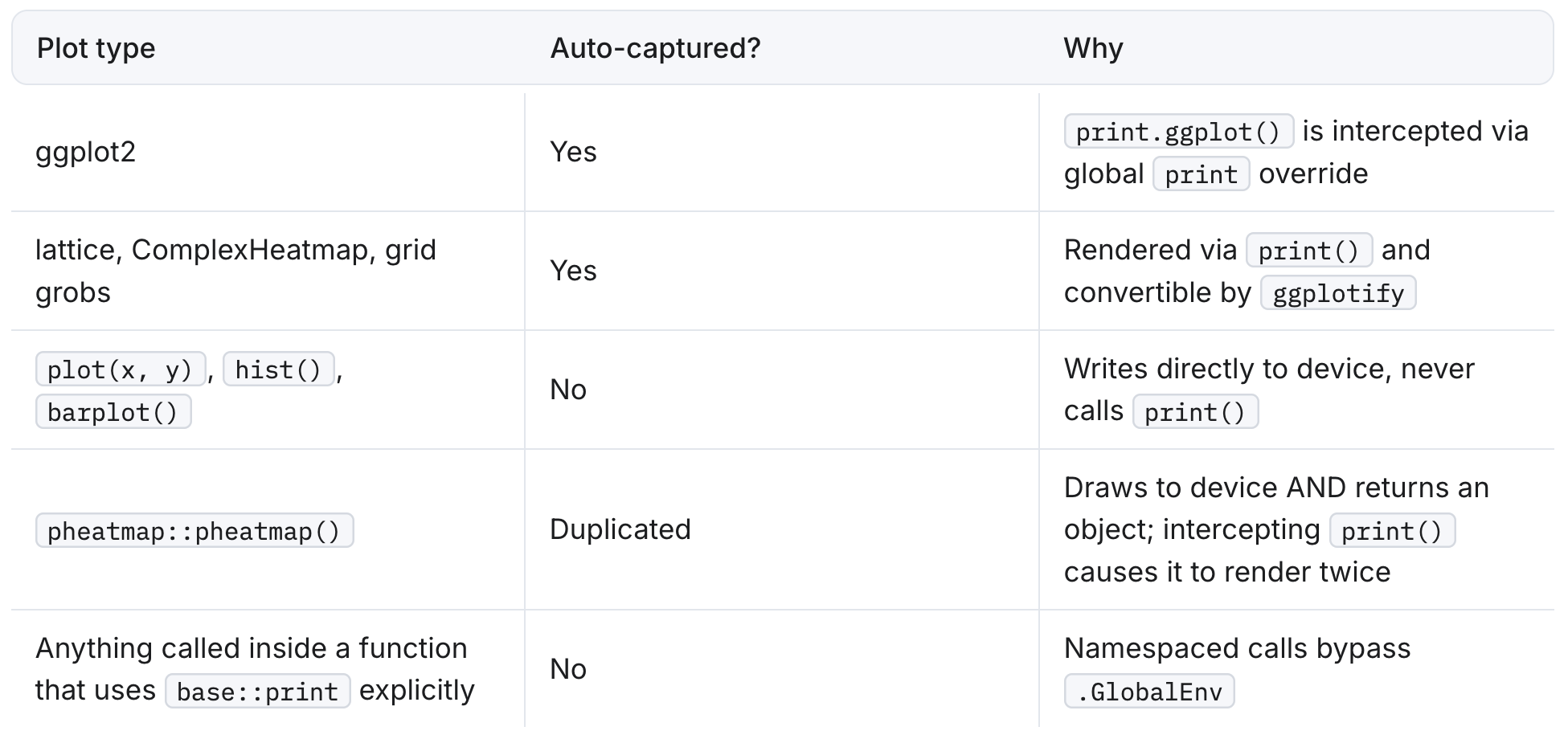 Auto-publish works for any object that satisfies two conditions: it goes through print() for rendering, and ggplotify::as.ggplot() can convert it. This covers a lot of common cases -- ggplot2, lattice (trellis), ComplexHeatmap, grid grobs, patchwork, and others. But the exceptions and edge cases add up: